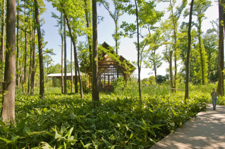 Situated on Adams Bayou, this project preserves more than 250 acres of cypress / tupelo swamp and wooded uplands, while restoring the historic Shangri La Gardens. A Visitor Center at the entrance orients guests to the site’s history and resources. Nature education and research facilities include an outdoor education center, classroom pavilions and bird viewing blinds, carefully situated within the preserve to provide hands-on learning opportunities. Suspended treehouse-like walkways minimize the structure’s footprint on the land. The project achieved the first LEED Platinum certification for new construction along the Gulf Coast.