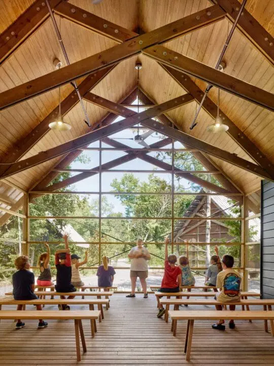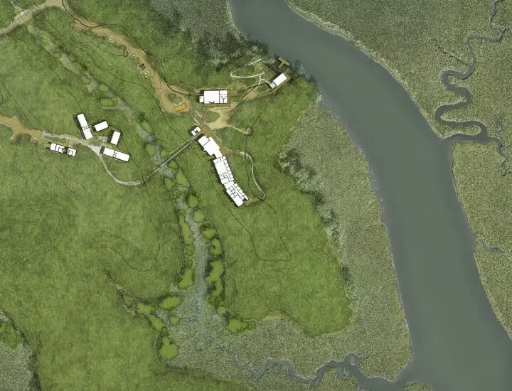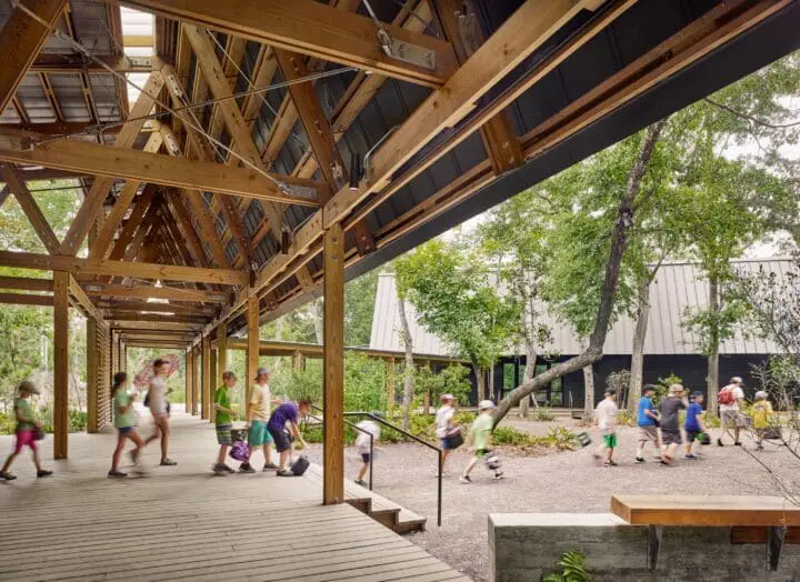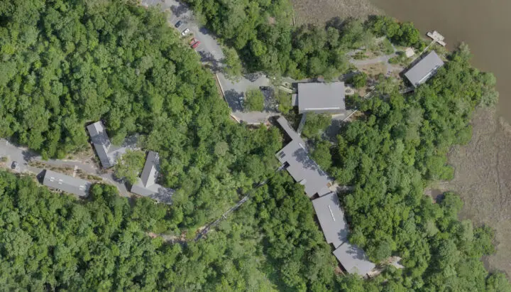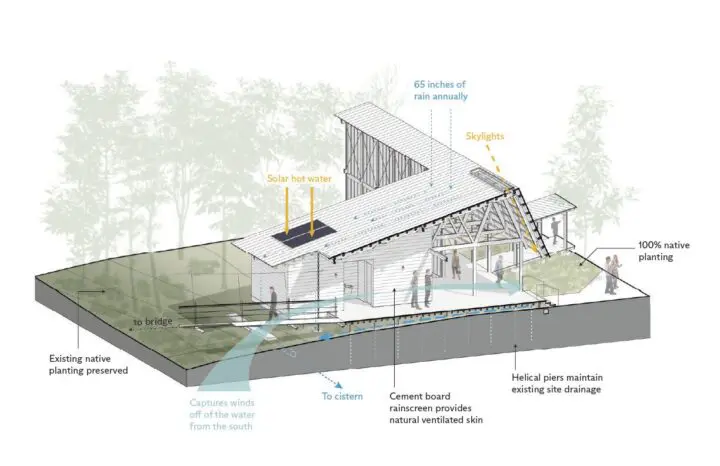 The design team consulted with biologists and coastal ecologists to assess flora and fauna, ultimately selecting the site with the least sensitive ecosystem, with access to open water and a suitable elevation to protect the buildings. The center’s six buildings are sited tightly within the existing tree canopy, allow the contiguous stand of trees to serve as a wind buffer and first line of defense. Low impact materials were selected for the health of occupants and to avoid ocean contamination in the event of a natural disaster.