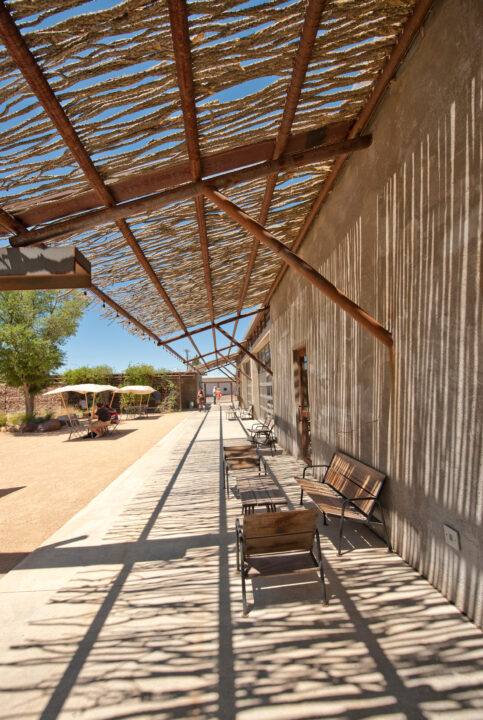 The renovation of The Capri Event Center, a World War I–era storage hangar, into a 4,000-square-foot community gathering and event space was the last phase of construction for Marfa’s Thunderbird Hotel. Masses of native plants and cacti anchor The Capri in its desert environment and a latticework of salvaged oil-field piping shades the breezeways and lounge areas with vines. Inspired by an ephemeral arroyo—Spanish for a dry creek bed—stormwater is quietly controlled through the garden to the town creek. Low stucco walls and a live ocotillo fence create a private oasis around the central water feature.