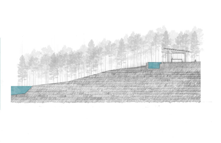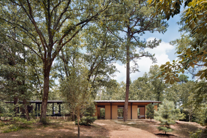 Located in East Texas, Aegean Pool House is sited on a hilltop overlooking a peaceful lake, surrounded by densely shaded pine forest. This weekend home is designed as an escape from urban life and emphasizes strong connections to nature and a sense of place. A key design feature was to encourage engagement with the outdoors by creating outdoor program elements, specifically the primary living spaces including dining and kitchen.