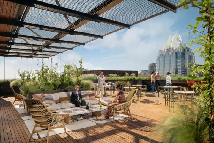 The lounge extends out to a new occupiable roof terrace that was previously not usable by tenants. The renovations include a new steel canopy with vine trellis, teak decking and groupings of soft seating all bordered by custom steel planters filled with lush, native landscaping. The terrace not only offers direct connection to the outdoors from 26 floors up, but also sweeping views of downtown Austin for users to enjoy.