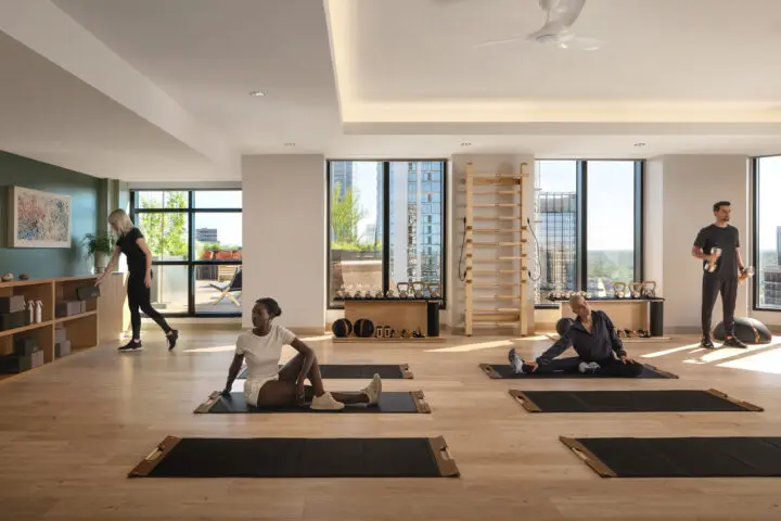 The amenity space on the 26th floor, The Highyard, was the first phase of the project to be completed and includes a bar and lounge, multipurpose meeting room, a fitness studio and outdoor terrace. At the heart of the Highyard is an inviting lounge with a mix of soft seating and café tables washed in soft, natural light.
