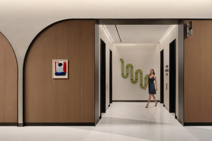 Dark and artificial materials were updated with white oak paneling, earthy textural plaster tones, a light terrazzo floor and blackened steel accents. Materials were thoughtfully selected to brighten the space while complementing the original materials on the upper levels. A new green wall was installed by a local agriculturist to greet visitors with greenery while hiding the previously exposed elevator shafts. Custom designed light fixtures, including the curved sconces throughout, continue to reference the building’s history while illuminating the space and creating a new dynamic intervention at eye level.