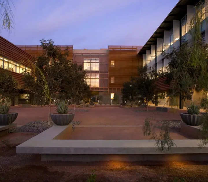 ASU Polytechnic’s Academic District transforms a decommissioned Air Force base into an inviting pedestrian district and regenerative landscape that creates a new identity for the campus. Five high-performance buildings are integrated with three existing structures, providing classroom and laboratory space for four academic colleges focused on engineering and the sciences. Buildings are configured around courtyards and linked by a series of open air atria, portals, and arcades to take advantage of the seasonally temperate climate for exterior circulation. These shady elements provide environmentally sensitive social spaces that maximize visibility, daylighting, and a sense of community while minimizing energy use.