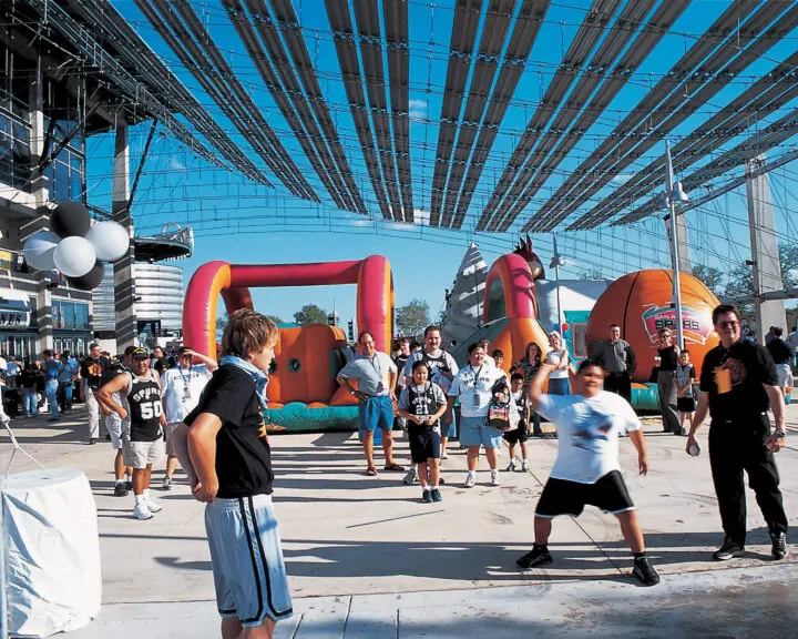 Between the arena and the adjacent coliseum, cables holding sheet-metal panels are strung as a sombrilla to shade the backyard plaza, an idea borrowed from local cattle yards.