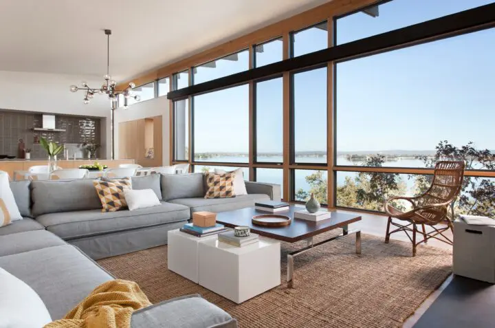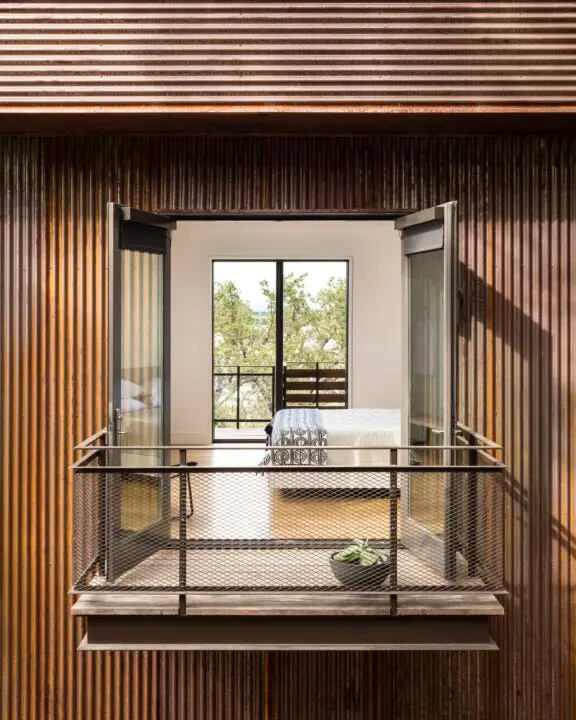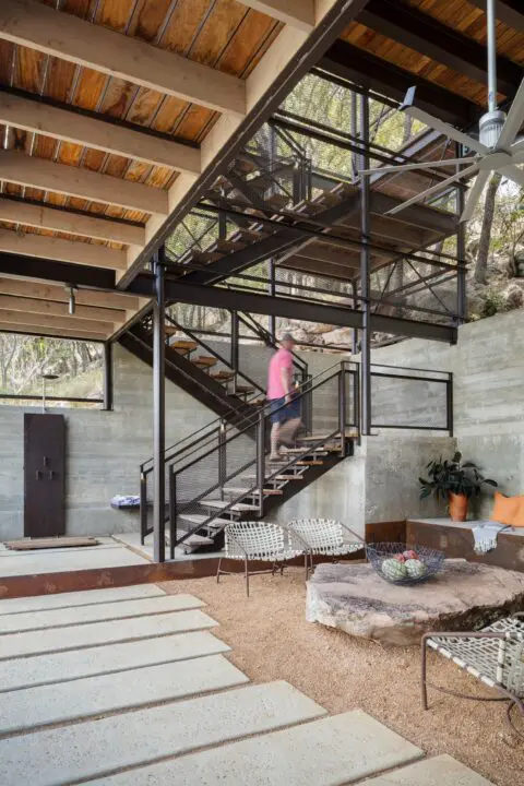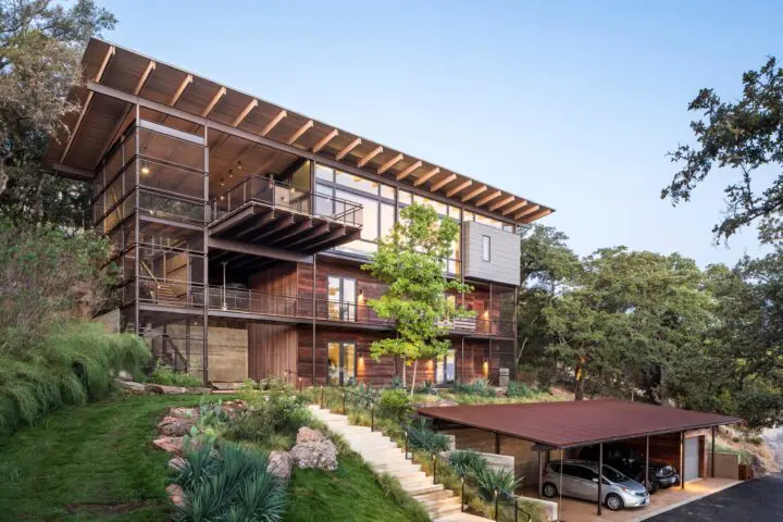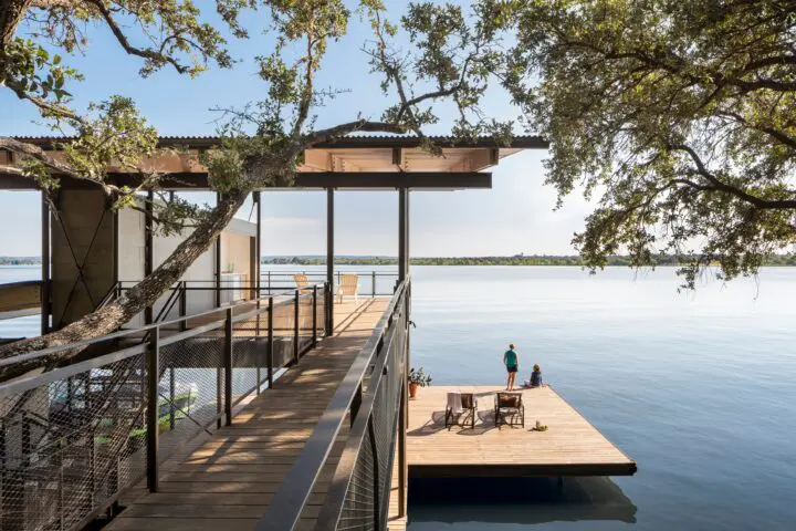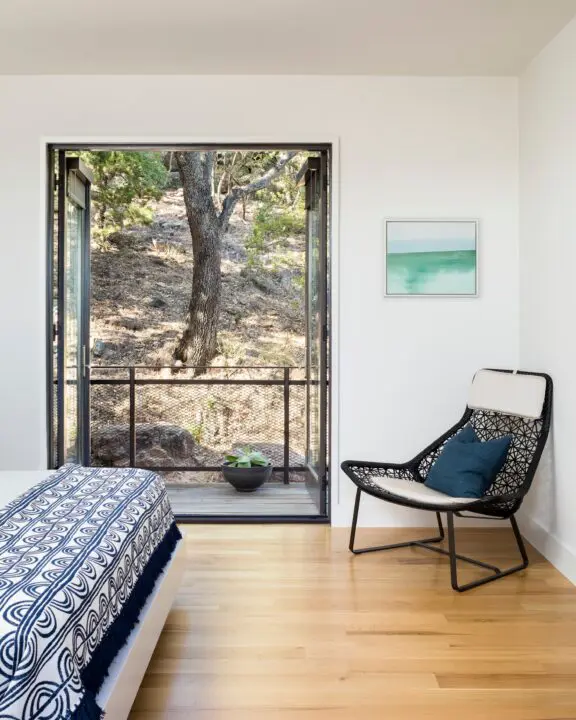 Further emphasizing the unique site’s juxtaposed landforms —water and rugged hillside—the third floor’s cantilevered deck reaches toward the water, while a bridge on the opposite side of the home anchors into the hillside behind, connecting the house to its surrounding landscape. Four separate bedroom retreats are tucked below on the lower two floors.