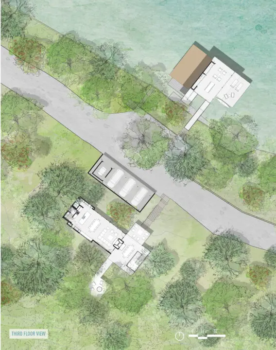 Responding initially to the site’s steeply rising topography, a vertically structured house reveals itself as the obvious design for this lake house. The long, narrow three-story residence dramatically culminates at the top floor, set just above the tree line and providing a nearly 180-degree view of the lake beyond. The third floor north-facing glazed wall offers unobstructed views of the lake, while smaller punched openings in the south-facing wall give deliberate glimpses of the rugged beauty of the hillside behind.