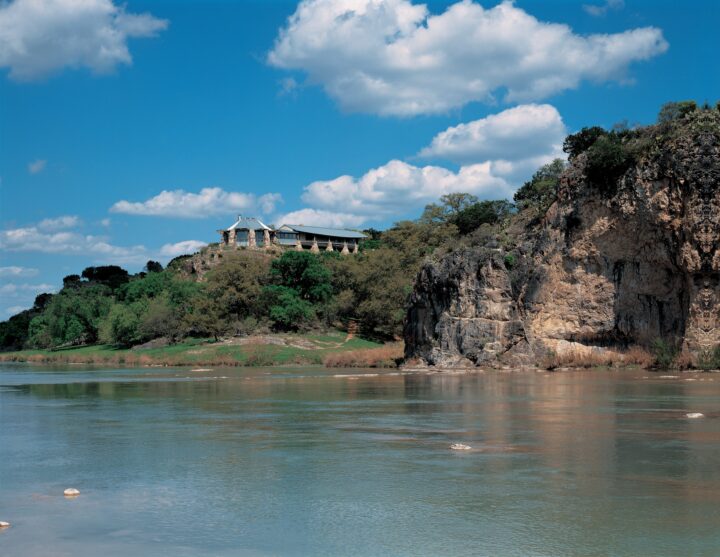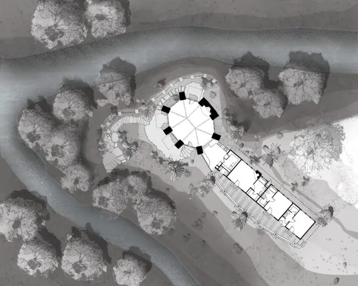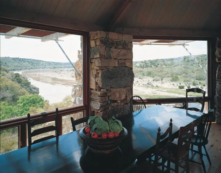 Perched above the steep and rugged limestone bluff of the Llano River in Central Texas, this house melds into the rocky landscape while preserving the natural, sensitive beauty of the cliff. A long, arcing entry porch creates a wide seating area at the bedroom wing, and leads to the main octagonal pavilion that serves as a living room and year-round lookout. Weathered limestone harvested from the site is stacked to create thick, sturdy corbelled piers that anchor the house to the site.