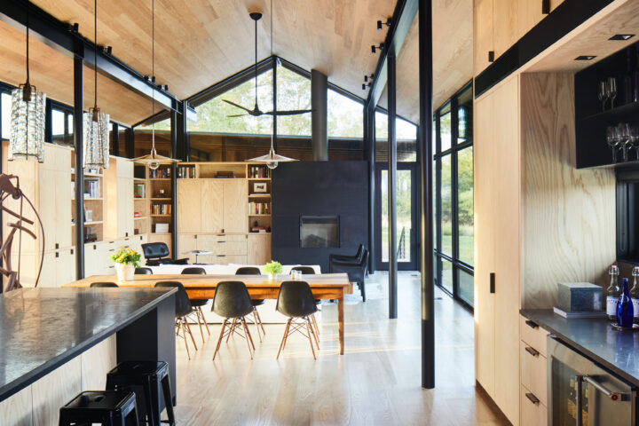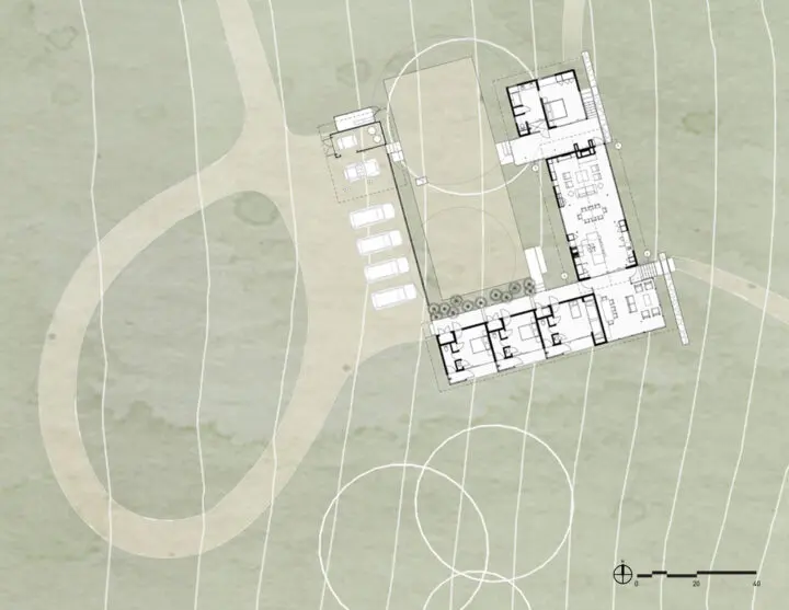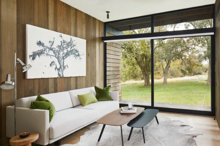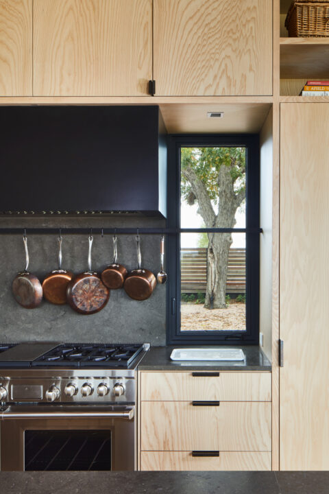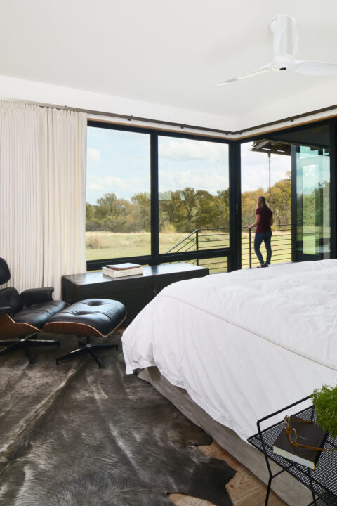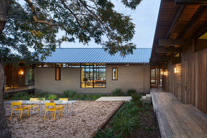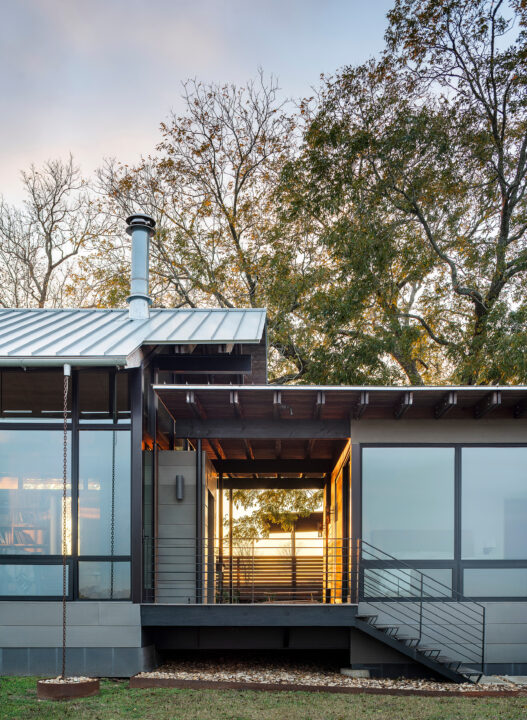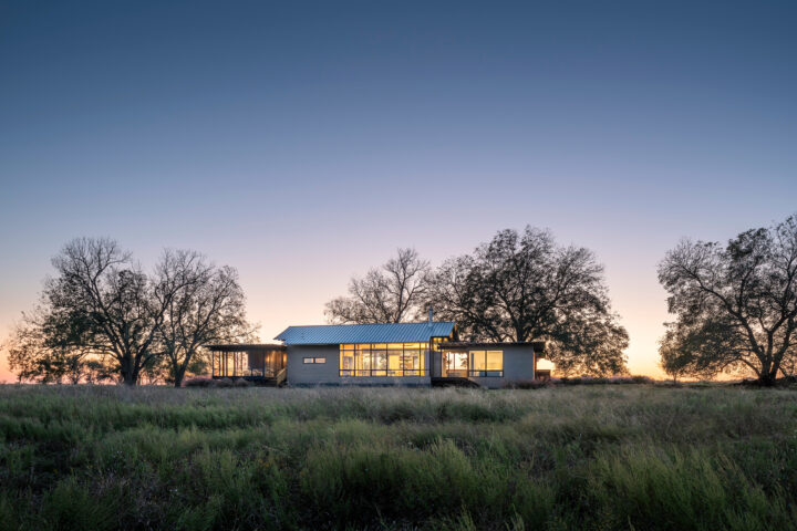 Situated on an open expanse of rolling hills overlooking a small pond, this house serves as an extended family’s countryside retreat. Several large pecan trees visually anchor the house to the hill while providing quiet shelter from the Texas sun. Elevating the home above grade allowed for the natural topography to flow beneath, isolating the structure from the heavy clay soil below.