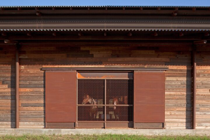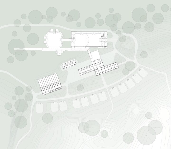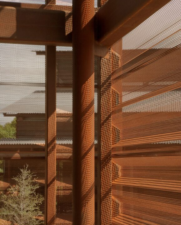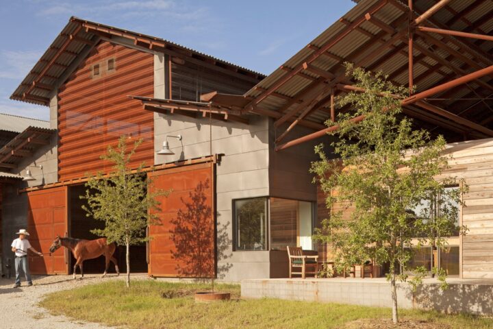 This 175-acre ranch in the Cross Timbers region of Texas was created for the care, training and breeding of cutting horses. The master plan includes pastures, roads and trails, an arena, horse barns, cattle pens and service structures. The long forms of the barns and arena are placed along a tree-lined creek to block the north wind, while taking advantage of summer breezes from the south. The arena cuts into the sloping grade to reduce the visual impact of this tall structure. Repeating gable roofs continue from the arena to the training barn, and provide cover for a connecting ramp, horse walker and wood-clad ranch office. Rusted steel pipe and perforated corrugated metal create a serene and durable palette of materials.