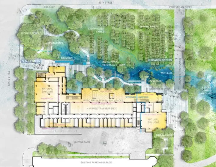 Georgia Tech’s Engineered Biosystems Building (EBB) is the cornerstone of a new research district located along a highly visible edge of campus. As a gateway building, EBB engages and activates the primary pedestrian axis through campus, outwardly expresses the innovation of its research programs. A small lobby and café serve as a living room where building occupants engage the broader community. At the center of the district is a restored historic watershed that celebrates low impact development strategies and includes an engineered wetland that filters and stores 100% of the building’s gray water demand and 100% of the district’s irrigation demand. EBB is a model of connectivity and synergy at every scale of design.