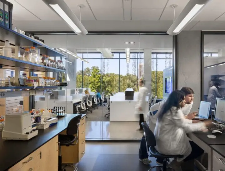 Georgia Tech’s Engineered Biosystems Building is an innovative new model for research facilities that challenges the silos of traditional laboratory design, creating a system of open lab neighborhoods that foster engagement. A departure from traditional lab design, this “cross-cutting lab” implements continuous working laboratory space running down the spine of the building, with offices and meeting rooms in the wings. Daylight, outdoor views, a water harvesting system, and other biophilic elements used throughout the program encourage interaction. Technology and intelligent design work together to create multi-purpose open spaces with high levels of ecological performance.
