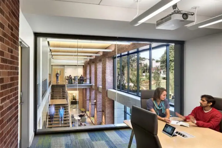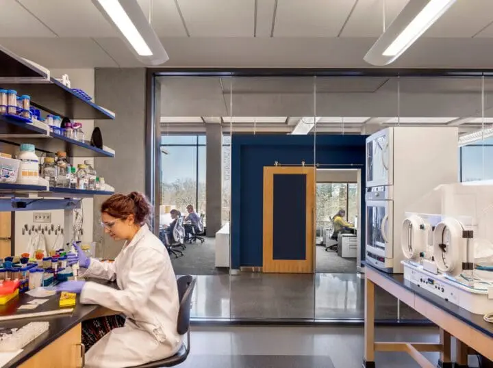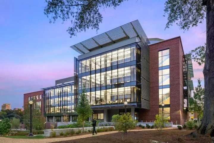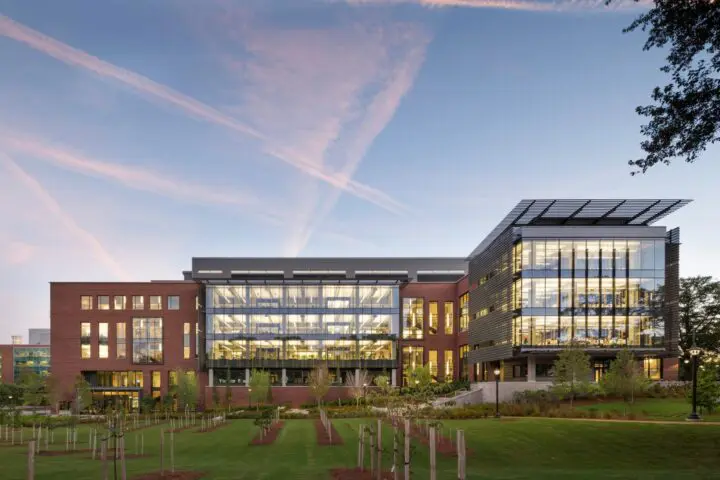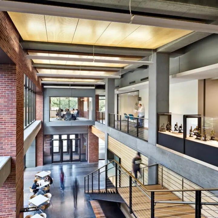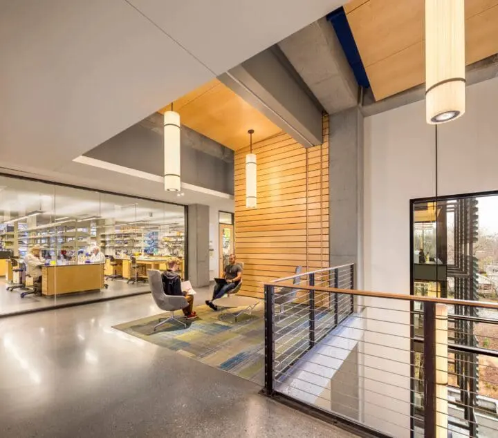Georgia Tech’s Engineered Biosystems Building is an innovative new model for research facilities that challenges the silos of traditional laboratory design, creating a system of open lab neighborhoods that foster engagement. A departure from traditional lab design, this “cross-cutting lab” implements continuous working laboratory space running down the spine of the building, with offices and meeting rooms in the wings. Daylight, outdoor views, a water harvesting system, and other biophilic elements used throughout the program encourage interaction. Technology and intelligent design work together to create multi-purpose open spaces with high levels of ecological performance.