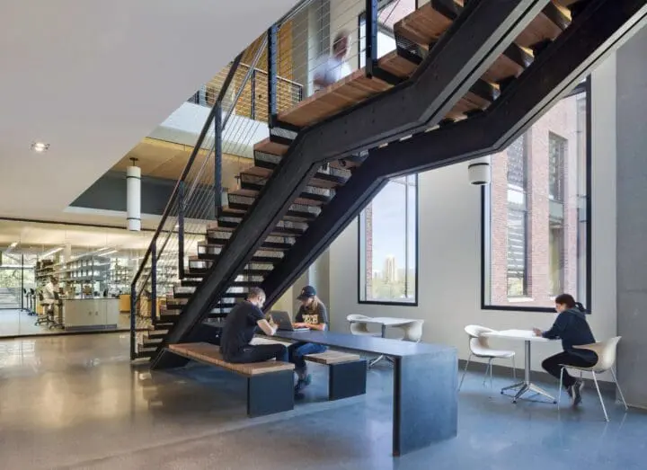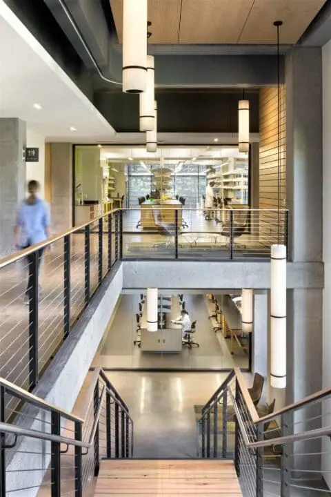 Lounges and break-out spaces are strategically located at thresholds to foster engagement both horizontally and vertically. The open floor plan concept and narrow building footprint maximize transparency and unobstructed views across the building while enabling daylight to permeate deeply and effectively. Technology, passive design strategies, and programming work together to improve user comfort and safety while minimizing energy demands, resulting in a 64% energy reduction against standard benchmarks.