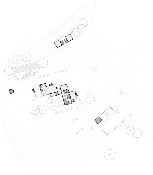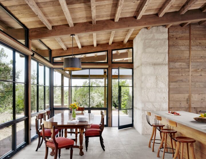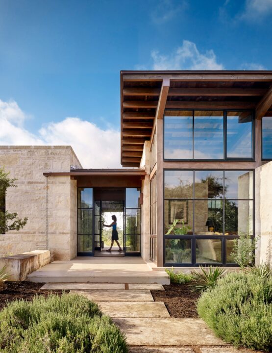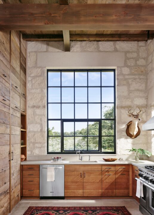 Seated on a heavily-wooded bluff, Goat Mountain Ranch tempers views overlooking the expansive Nueces River Valley to the southwest and upward views of Goat Mountain and a bowl-shaped ridge encircling the site’s northern half. A wood-crafted arbor covered in vines welcomes guests in an entry breezeway with shade, dramatic dappling of light, and direct views to Goat Mountain. The breezeway unites the two volumes of the house — a main living area to the west, and a master suite and library to the east. Open and spacious, the main living area connects the living room, kitchen and dining in one volume. A reading nook adjoins the living room as a cozy place to watch wildlife. East of the breezeway, a simple stone parapet box houses the library/guest room and laundry/storage space. Another shed roof floats over the stone parapet to form the master bedroom with great views made private by the stone parapet box. Outfitted in natural and local materials that weather gracefully, the home features materials the owner collected over time from her family’s Louisiana farm. Reclaimed wood siding is incorporated in ceilings and interior walls while steel kettles, once used for boiling sugar, are reinterpreted as water catchment containers for the rain water system. These reclaimed materials provide Goat Mountain Ranch with both a rich patina and reverent nod to the owner’s family history. This project is LEED Certified.