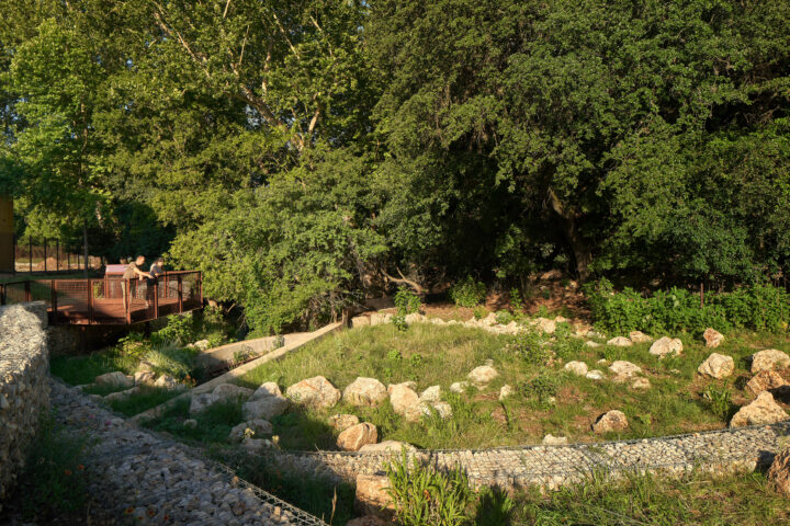 Many structures and existing building pads on the 16-acre property were reused to reduce the carbon footprint and restore as much of the site to its natural state. A major spring head was un-capped, cultivating riparian zones and restoring habitat for native species.