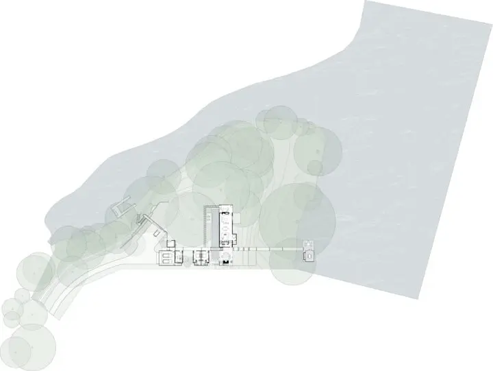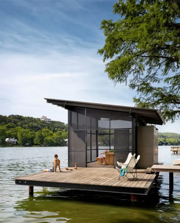 Situated at the confluence of Hog Pen Creek and Lake Austin, Hog Pen Creek Residence was envisioned by its owners as a place that evokes the playfulness of summer on the lake and emphasizes exterior living space. Towering heritage oak trees, a steeply sloping site and aggressive setbacks from the water created challenging site constraints thoughtfully answered by the home’s L-shaped footprint and orientation. A long exterior boardwalk connects a series of structures that stair step down the hillside, crossing a 75-foot lap pool and terminating at a screened pavilion by the water’s edge. Twin porches and a two-story living area, with a treetop level master bedroom loft and “crow’s nest” office, allow the house to be both intimate and social, effortlessly engaging guests and owners.