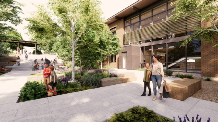 A portion of the existing middle school “B” building will be demolished to create a landscape connection to the new 7th and 8th-grade “A” building, navigating over 10’ of grade change.