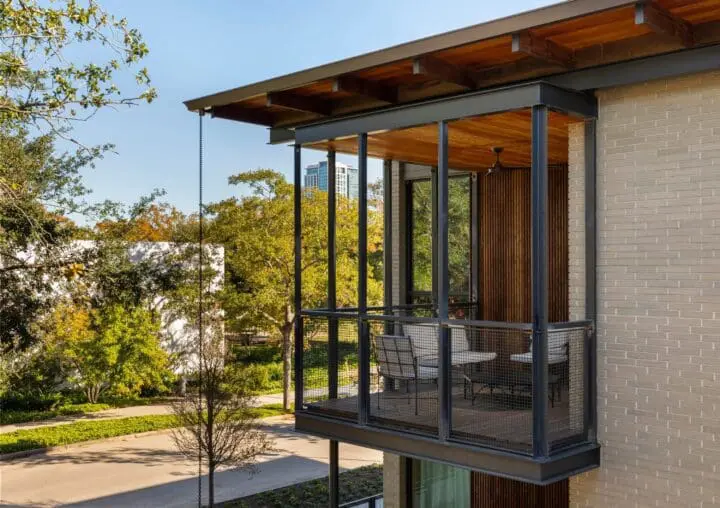 The individual buildings are connected by accessible, open-air bridges and walkways that maintain the hotel’s residential scale while encouraging guests to explore and be immersed in nature. The buildings’ materiality also reflects a sense of deference to the surrounding neighborhood, with gray norman brick masonry facades and combed ash-wood siding that complement the design of the nearby Menil Collection, as well as the local vernacular.