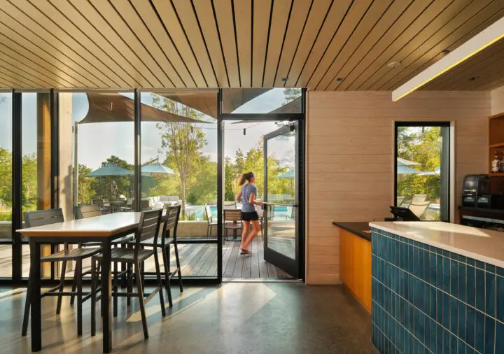 To ensure a constant connection to nature, exterior circulation and generous windows blur the line between indoors and out. A network of paths weave through the woods that surround the lake and connect the two distinct residential areas to the clubhouse and community lawn.