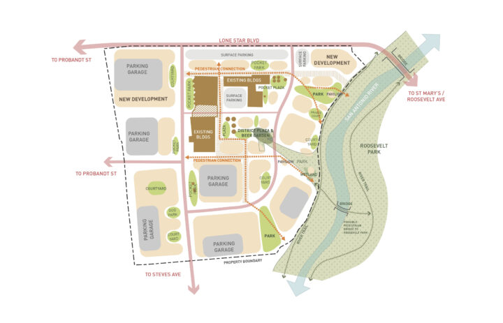 The Lone Star Master Plan reimagines the 32-acre Southtown site along the San Antonio River into a multi-phase, walkable, mixed-use destination featuring the redevelopment of historic buildings, vibrant open spaces, and access to the river. The project strives to build on the heritage and connectivity of the miles of existing trails by embracing and activating the river’s edge with parks and open spaces, creating a regional connection to the larger community.
