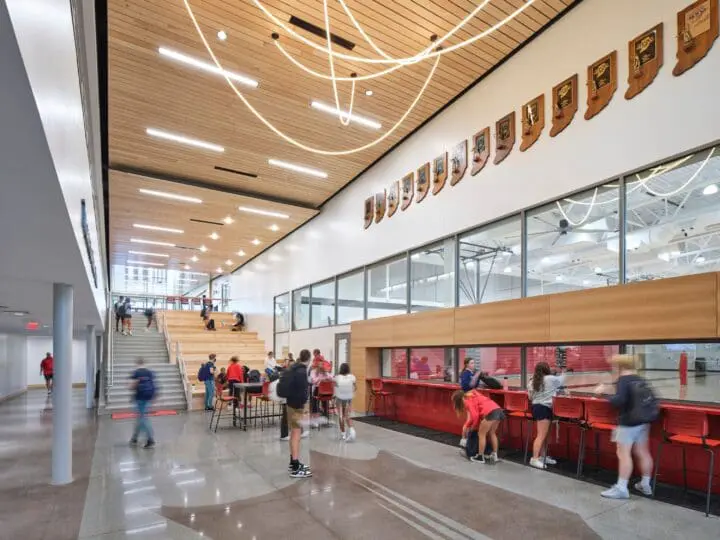 The Student Wellness Center features competition/practice courts, a community fitness center, strength/conditioning facilities, health education classrooms, an alumni center, multipurpose rooms, team rooms, a coaches’ suite, and a café to reinforce proper nutrition within a culture of fitness. The gymnasia are voluminous, with exposed trusses and careful implementation of clerestory daylight to prevent glare.