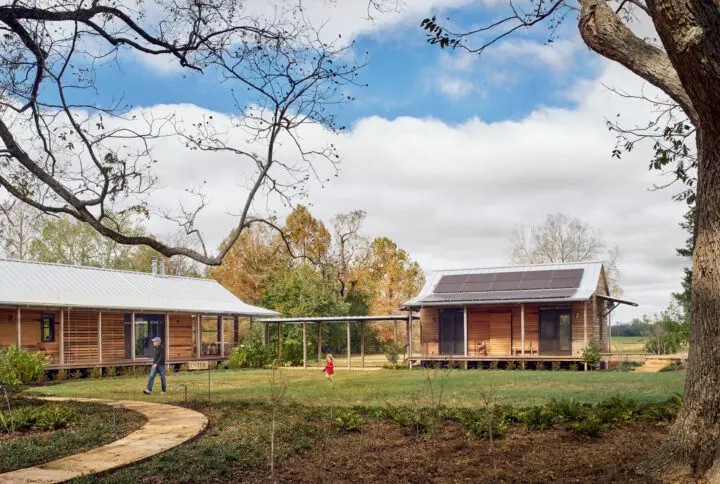 Pono is a series of simple spaces in simple forms designed for a client with a sustainable farming operation. The sun rises over planted fields to the east and drops over the bayou to the west, with the business of farming happening all around in response to the daily needs of livestock and seasonal patterns of cultivating crops.