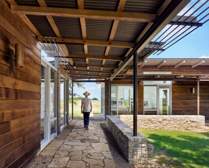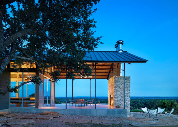 Drawing on distant views from a bluff top, this 3,200-square-foot addition to an existing ranch house shared by four sisters in Weatherford, Texas, was designed to accommodate their need for additional communal living areas and guest space. In addition to four new casitas—one for each sister—a new building was designed as an informal lounge and game room including a simple, modern kitchen which opens up to a large outdoor living space around a central fireplace. A grove of existing oaks sets the perfect stage for a new courtyard on the side of the house. Covered walkways connect the elements of the addition while also linking the addition to the original house. All stone was harvested on-site and low-maintenance materials were implemented throughout, including concrete floors, stone walls, weathered steel, metal roofing and siding.