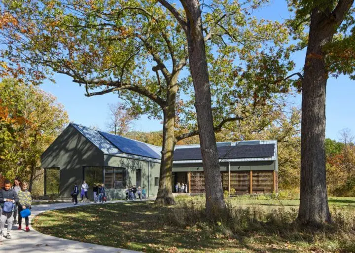 Nestled within the flatwoods along the Des Plaines River, the Ryerson Woods Education Facility acts as a beacon of both ecological education and environmental stewardship for the Lake County Forest Preserves and region at large. In addition to supporting educational programs in partnership with local schools and community organizations, the net-zero energy building serves as a trailhead for the surrounding 565-acre Ryerson Woods Conservation Area. Funded through a grant from the Illinois Clean Energy Community Foundation, the facility achieved Phius ZERO certification and uses 80% less energy than a comparable code-compliant building.
