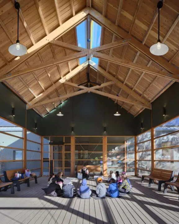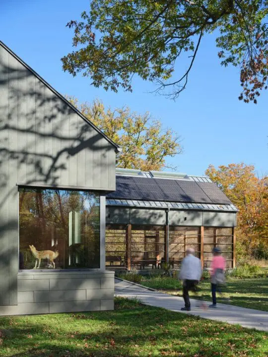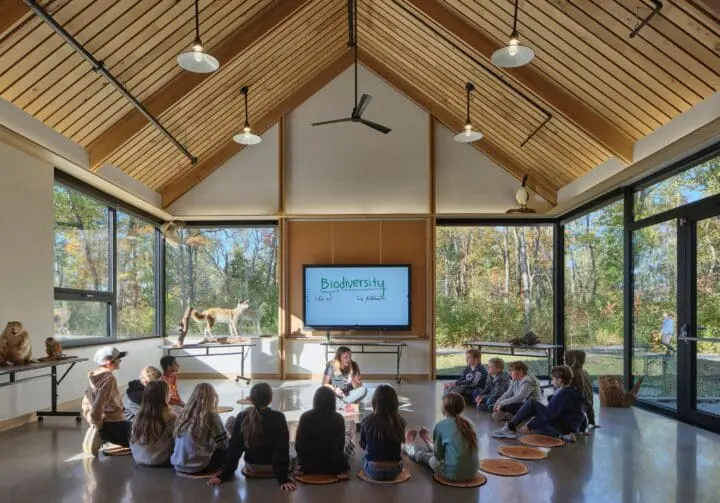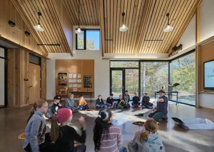 The center offers a variety of educational programs, including field trips for schools and scout groups, as well as public events throughout the year. Its two classrooms, virtual teaching space, and a 900-square-foot screened-in outdoor classroom provide versatile spaces for learning. The design emphasizes transparency and openness, with large windows offering views of the surrounding forest.