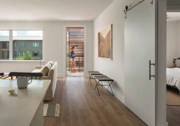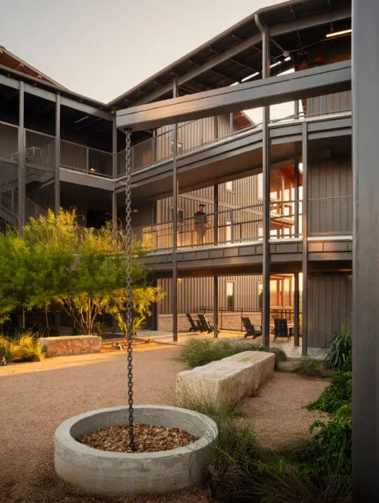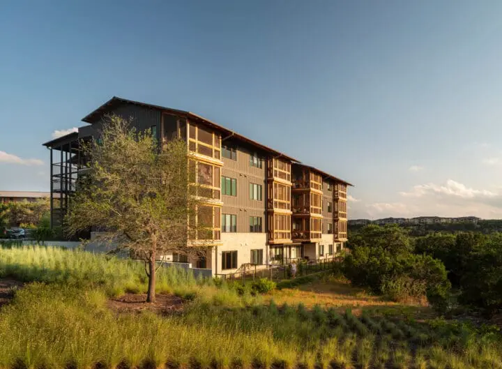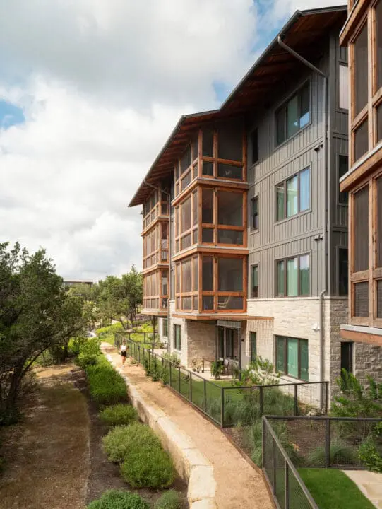 The Saint June incorporates several design strategies and amenities not typically found in multi-family developments. The community is centered around occupant wellness and environmentally conscience living. Screened porches allow residents to immerse themselves in views of the Hill Country. All ground level units have walk out yards. The site is woven throughout with nature trails and native vegetation, providing residents with a true Hill Country living experience.