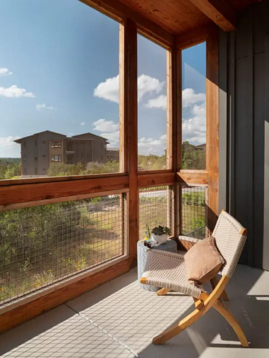 Perhaps the most distinguishing feature of the project are the screened porch outdoor living spaces that adorn every unit on the viewshed sides of the development. These screened porches allow residents to enjoy Hill Country breezes and views.