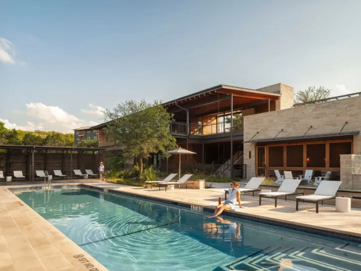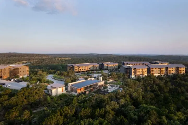 The Saint June is a 182-unit, luxury multifamily community located on 36 acres in the rolling hills of Barton Creek. The community was designed with a contemporary aesthetic and biophilic focus, consisting of natural exteriors complementing the Texas Hill Country and modern interiors. The seven buildings are nestled within native landscape courtyards and strategically sited to preserve open space and optimize views while protecting heritage trees and habitats.