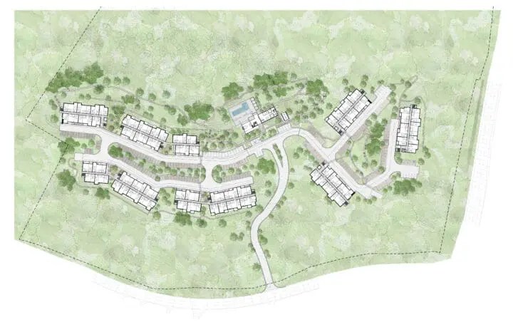 The apartment buildings trace the natural topography of the hillsides, embedding the residential structures into the steep grades and allowing for at-grade walk out units. Shorter segments of buildings are connected via open air bridges to harness natural breezes. These breaks in the buildings allow for more porosity and views to the surrounding landscape.