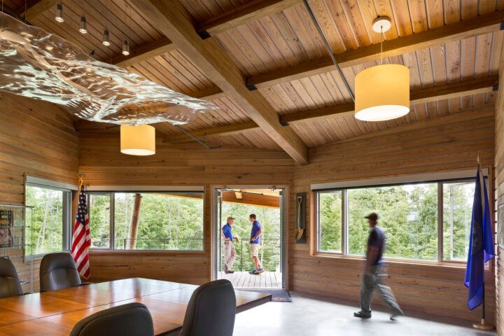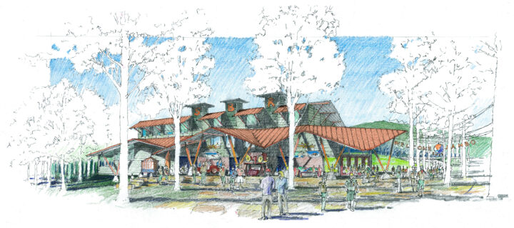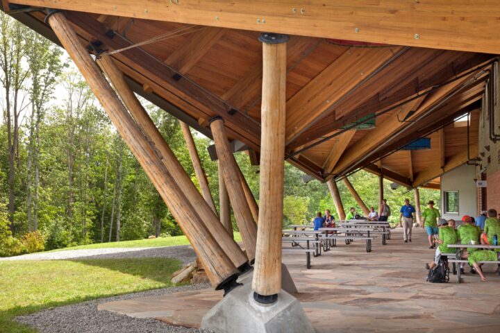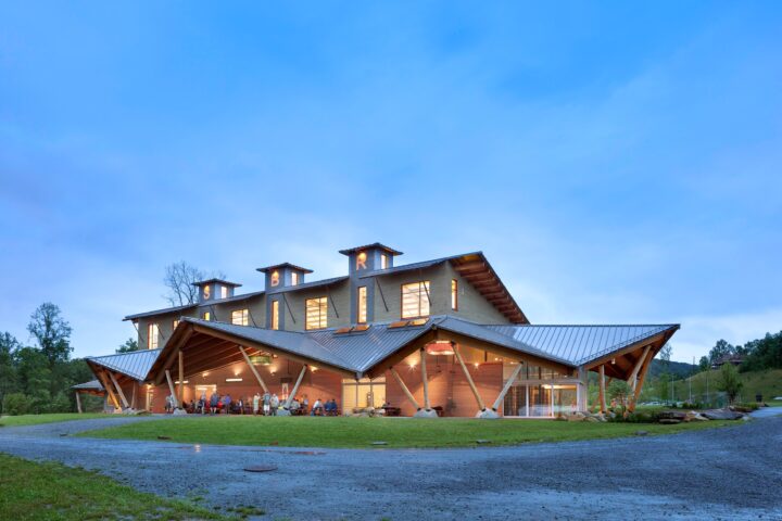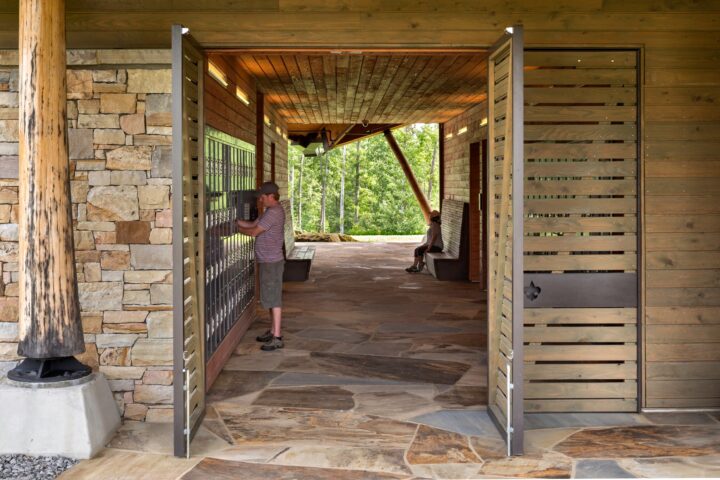 The Scott Visitor Center is located at the portal to Gateway Village. The first Summit building seen from the road, the parking drop-off leads down past a knoll of grass to the scouting grove, where twelve great, tall trees provide shade and shelter while telling a story about the twelve principles of scouting. Once past the grove, a tall welcoming porch greets the visitors and guides them to the front door.