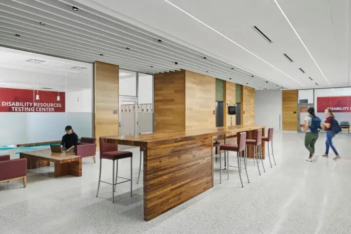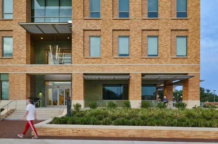 Located in the heart of Texas A&M’s College Station campus on the former site of Bizzell Hall, the Student Services Building is a welcoming destination designed to enhance and activate the communal core of campus by encouraging student interaction and collaboration among its resident departments. Tall windows and inviting entryways highlight this warm, highly visible, and easily accessible building. The facility is located along some of the most widely traversed campus walkways and its forward-thinking design and materials complement nearby campus structures. Sensitive landscaping features enhance the area while paying subtle tribute to the history of Bizzell Hall. Inside, students find numerous key student services as well as bright, comfortable conference rooms and common areas where they can relax in a quiet environment.