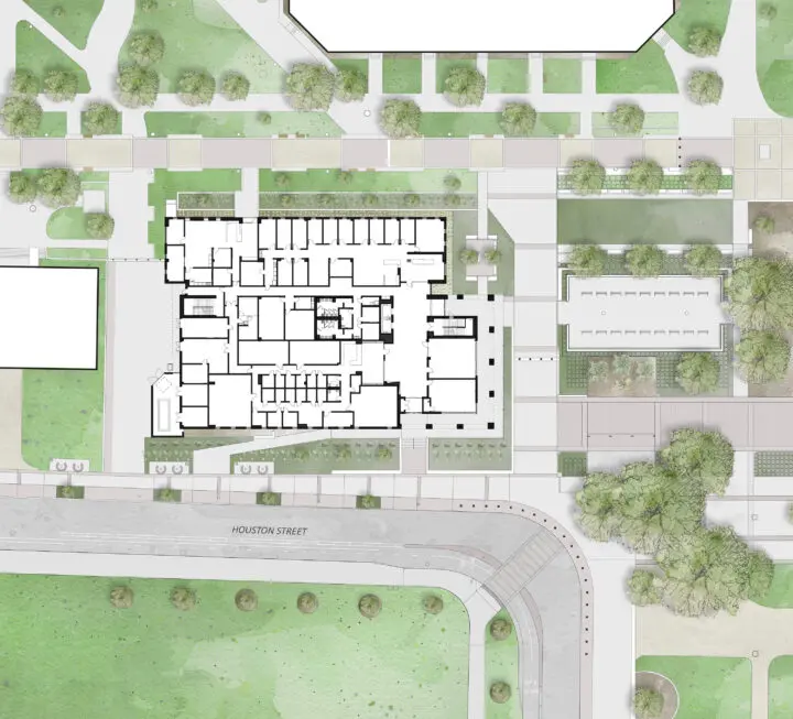 The plan is shaped by intense pedestrian flows along the Military Walk, Memorial Student Center, and Main Bus Service pathways. The building was broken into two distinct masses; a three-story volume that responds to the more intimate historic Military Walk and smaller surrounding buildings, and a four-story volume that anchors the east end on the expansive Parade Ground.