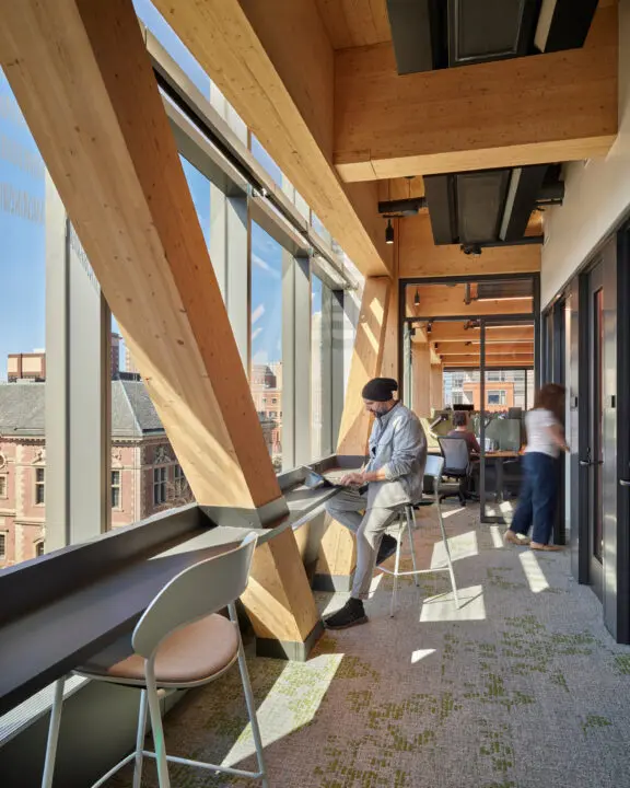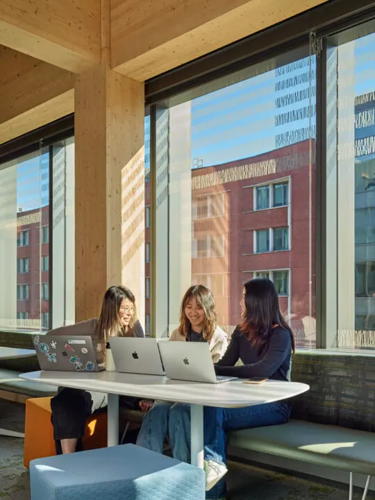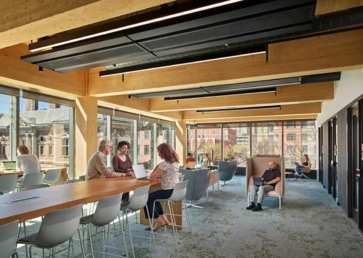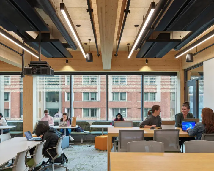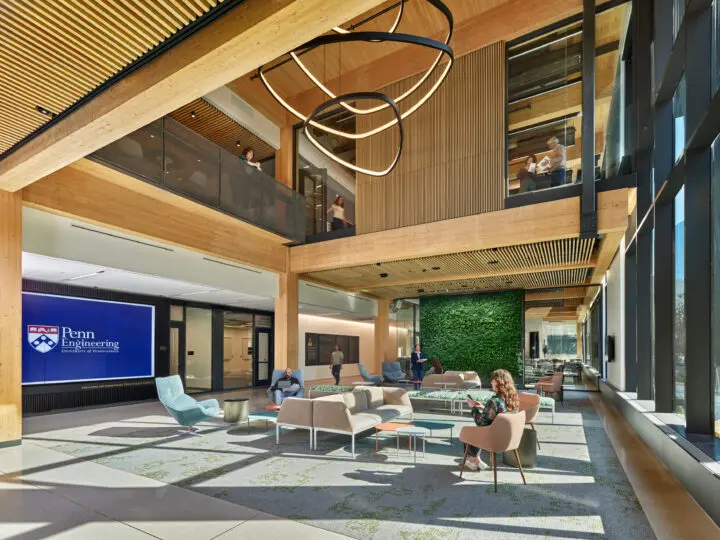 Amy Gutmann Hall is Penn Engineering’s new home for data science and AI. At six stories and 116,000 square feet, the building is the tallest mass timber academic facility on the East Coast. Named for the university’s longest-serving president, Amy Gutmann Hall connects building occupants, who work in a digital realm, back to the natural world—maximizing views and daylight, integrating ecological environments into interior spaces, and incorporating sensory stimuli that encourage collaboration and comfort. The cutting-edge mass timber system significantly reduces the building’s carbon footprint and reinforces its identity as a beacon of innovation.