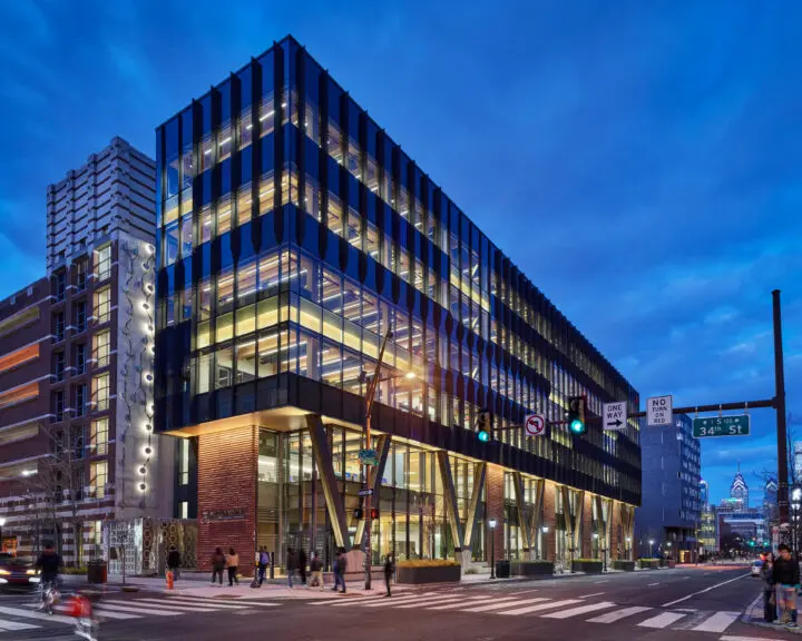 Housing Penn Engineering’s data science research and academic programs, Amy Gutmann Hall is a vibrant and welcoming hub for cross-disciplinary collaborations focused on harnessing the power of data and AI. The facility houses three floors of teaching labs, active learning classrooms, and collaboration spaces as well as three floors of research centers. The ground floor serves as a home base for data science and AI programming with a gracious student commons and a quiet reading room, collaboration spaces, and a large lecture hall.