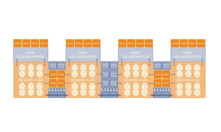The upper three floors are organized into large, flexible “neighborhoods” of 35-40 researchers, each linked to adjacent labs through shared collaboration zones. Small, open kitchenettes are strategically positioned throughout the research zones to bring researchers together for informal, serendipitous conversations that foster community and support a shared sense of vibrancy and innovation. A larger kitchen and break room, located on the fifth floor, serve the entire research community and host community events.