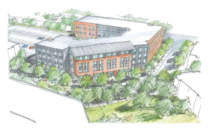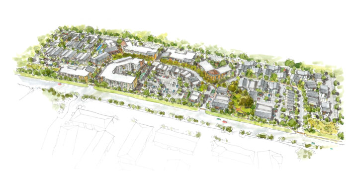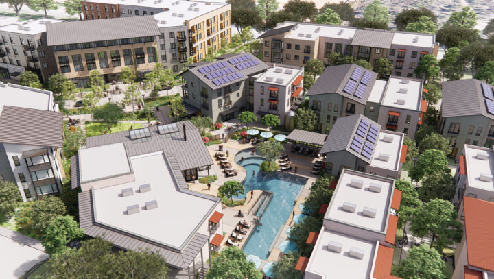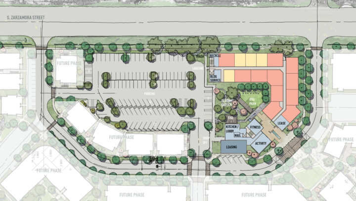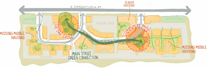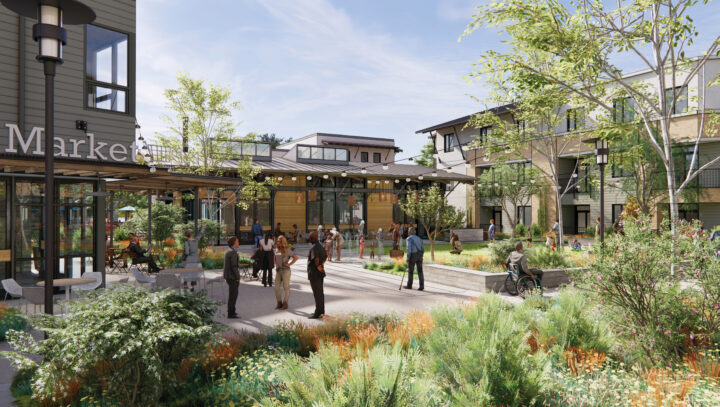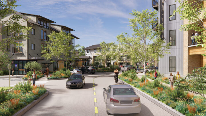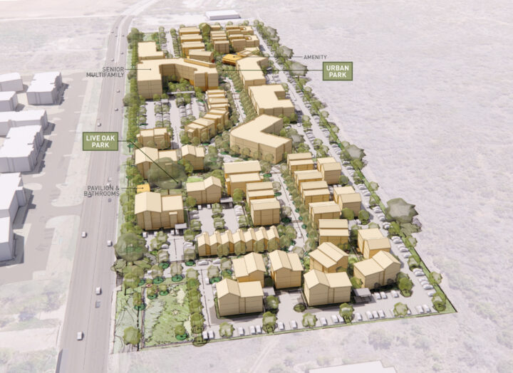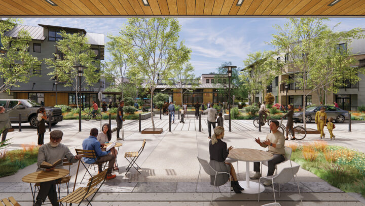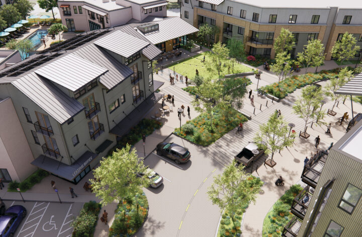 A layered mix of housing types and open spaces fosters community and human-scale living. Senior apartments, townhomes, and 4-plexes create diversity in scale and density, while open spaces range from private courtyards to shared greens and public parks. Two larger parks—one active, one tree-filled and serene—are linked by a pedestrian-focused street with a double tree allée, forming a strong spine through the neighborhood.