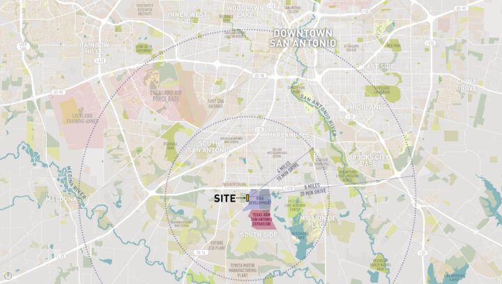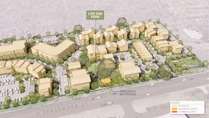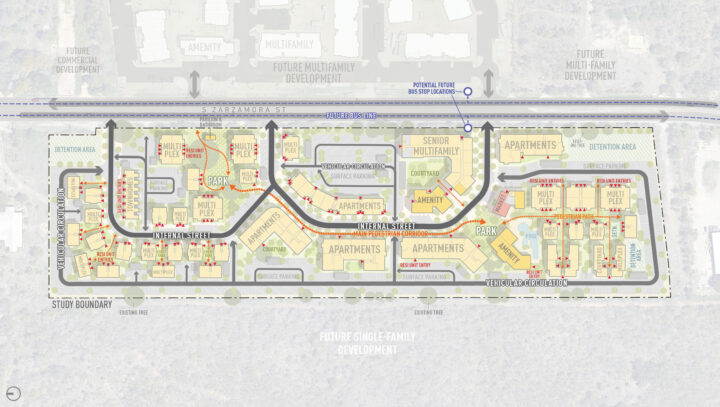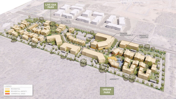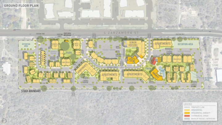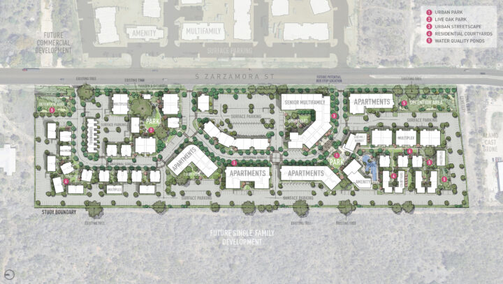 Set within the larger VIDA master plan, this future affordable community in South San Antonio reframes how neighbors live together. The first phase begins with senior housing, followed by family-focused “missing middle” homes that bridge generations. Homes are stitched into a network of green spaces—private courtyards, shared lawns, and two generous parks—while parking is quietly tucked away to keep streets walkable. A tree-lined pedestrian spine becomes the social heart, where street-facing entries and intimate clusters of homes foster community engagement. Anchoring it all, an Amenity Center with a gym, pool, and lounge extends daily life outdoors, shaping a neighborhood rooted in connection, identity, and belonging.
