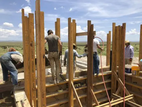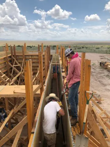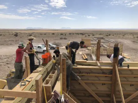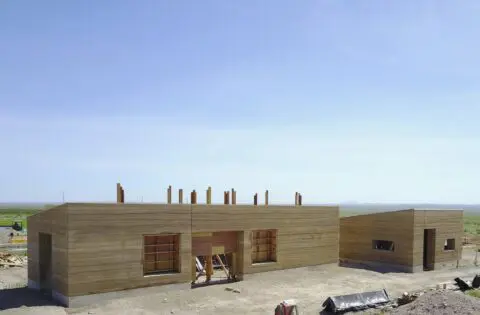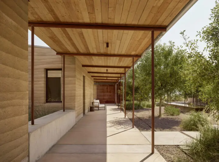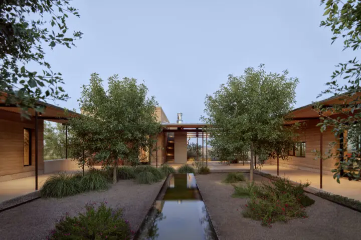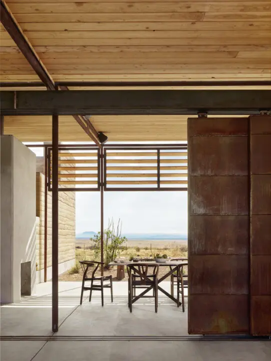 Borrowing from the area’s earliest structures, the rooms of the house are organized around a courtyard, a cool respite from the sun-drenched desert grasslands beyond the walls. The house embraces the expansive landscape with lightweight breezeways and porches made of recycled oil field pipe.