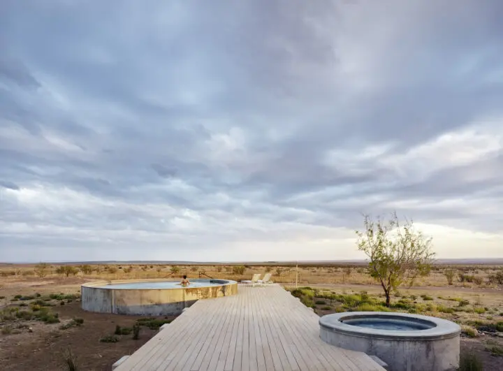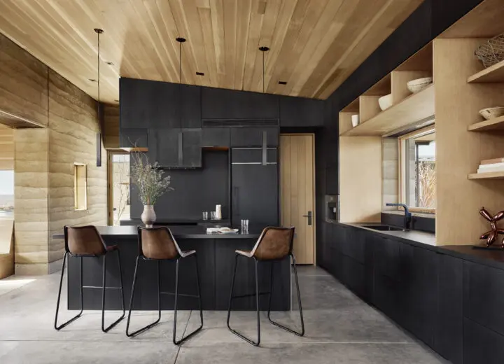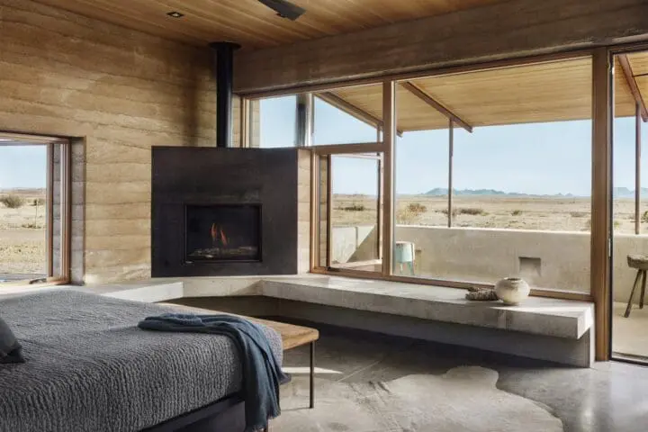 Sandwiched between the inhospitable Chihuahuan Desert and the majestic Davis Mountains, the Marfa Ranch is situated on a low rise with dramatic views of pristine desert grassland in all directions. The house, which cuts a low profile, comprises eight structures organized around a central courtyard shaded by native mesquites. Built of two-foot-thick rammed earth walls, the home protects its inhabitants from the extremes of the region — heat, cold, and wind — while allowing them to connect with the landscape through lightweight breezeways and porches, a mirador perched above the main bedroom, and an outdoor walkway connecting to a pool and hot tub.