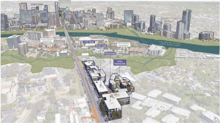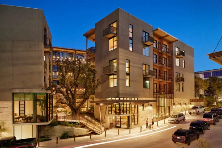 Music Lane’s mixed-use storefront, hospitality, and office spaces feature a diverse range of retail, dining, entertainment, and workplace options that capture the glitz and grit of Austin. By integrating goals for density, shading, landscape, and pedestrian connectivity where they didn’t previously exist, Music Lane extends and enhances the popular South Congress District—creating a safe, accessible, and enticing destination that references some of the best aspects of walkable Austin.